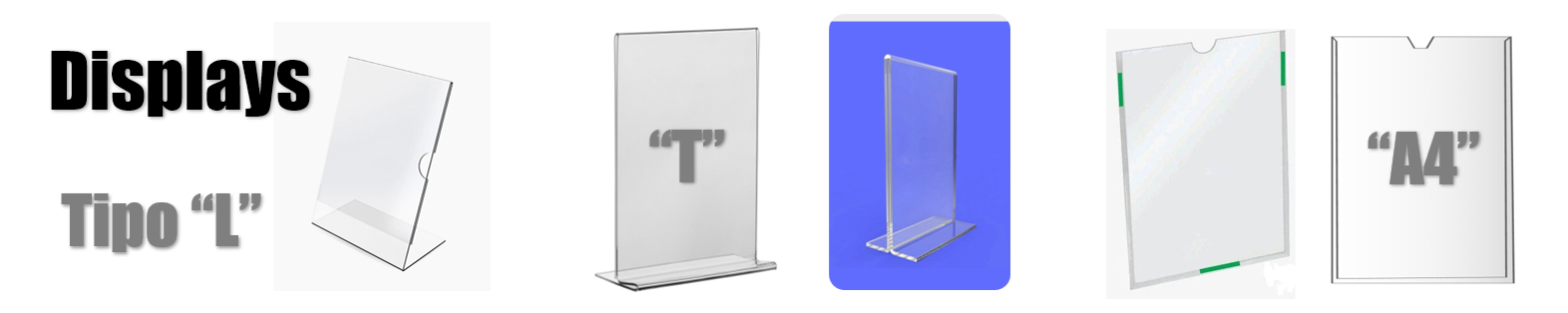 Displays de Acrílico e PS para exposição de folha A4 - posição vertical e horizontal (Pronta Entrega). Temos também para Pronta Entrega Displays tipo 'T' tamanho 10X15cm..