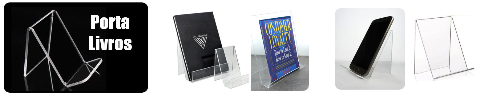 Displays de acrílico (Expositor Porta Livro) com suporte para diversos tamanhos de livros. Ideal.para expor livros em Mesa, Balcão, Prateleiras, Escritórios, Vitrines, Lojas, Estandes, Livrarias e Bibliotecas..